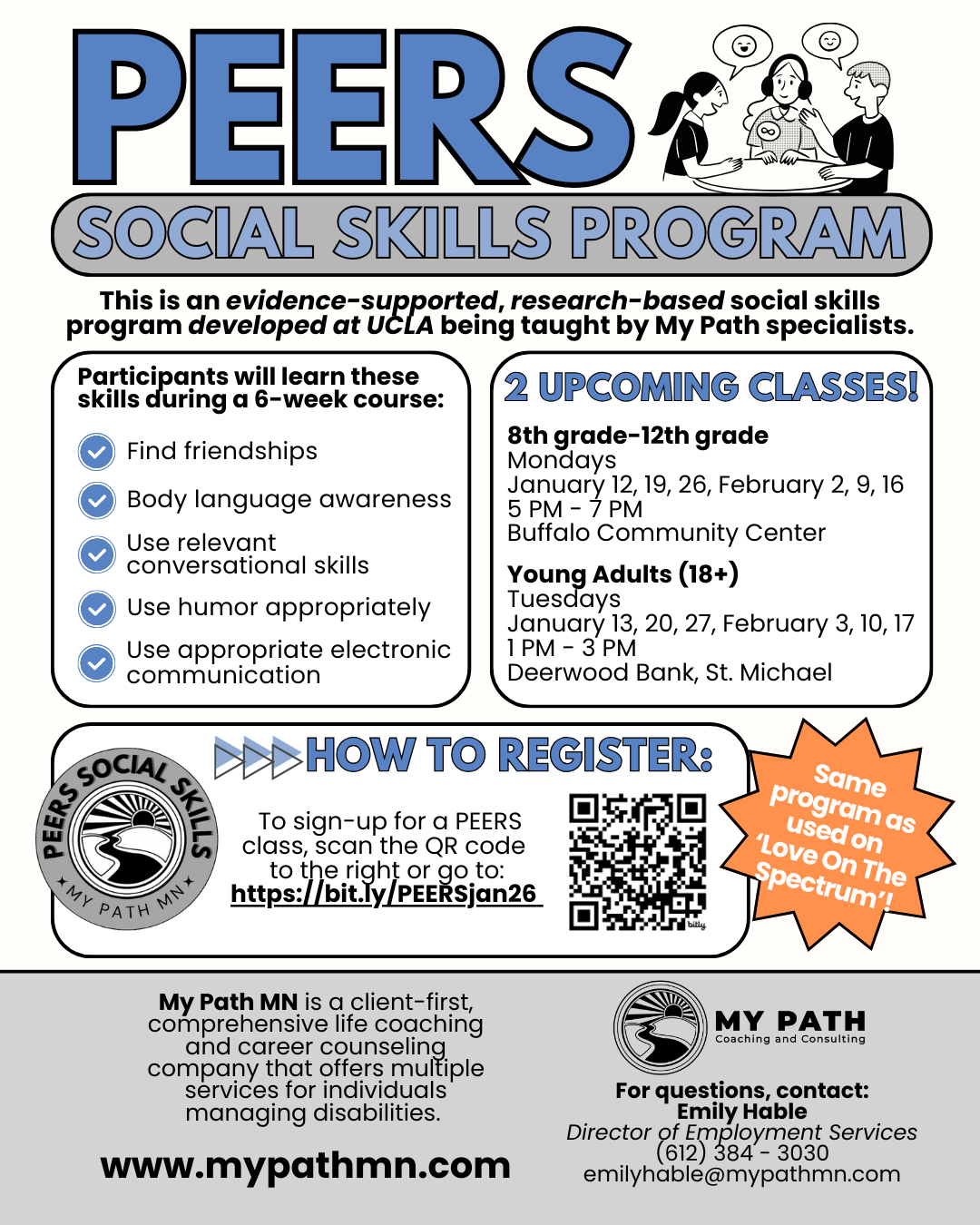 My Path is a comprehensive life coaching and career counseling services program that offers a continuum of options for those seeking career exploration, post-secondary education planning, pre-employment skills, life skills, employment skills, disability advocacy, and more. All services are designed with one common theme: accomplish our client’s goals.